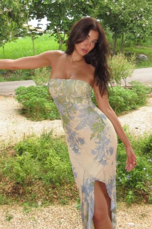 Light Blue Floral Print Strapless Homecoming Dress With Ruffled Skirt