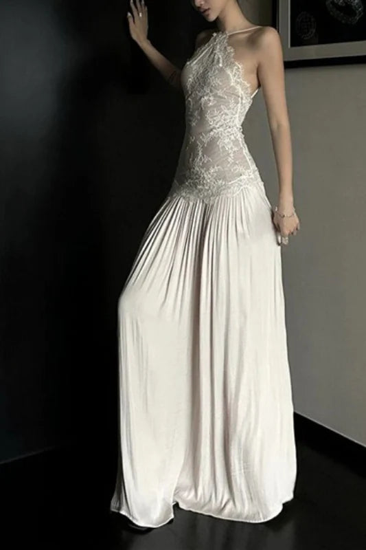 Halter Neck Ivory Lace & Satin Maxi Evening Dresses with Sheer Lace Bodice and Pleated Floor-Length Skirt