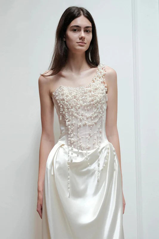 One-Shoulder Ivory Beaded Satin Evening Dresses with Sheer Mesh Bodice and Pleated Floor-Length Skirt
