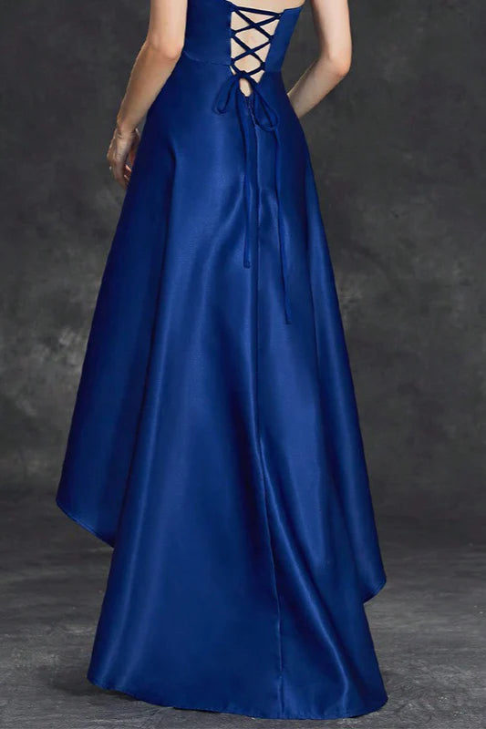 Strapless Sweetheart Royal Blue High-Low Satin Evening Dresses with Rhinestone Accent and Lace-Up Back