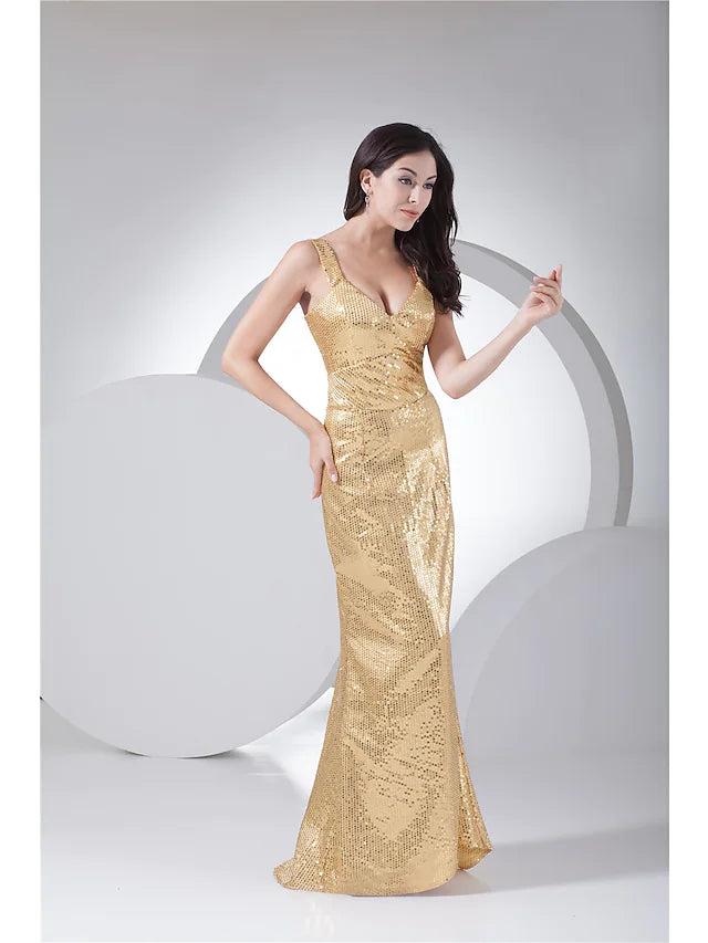Mermaid Trumpet Prom Dresses Elegant Dress Formal Evening Floor Length Sleeveless V Neck Sequined with Sequin