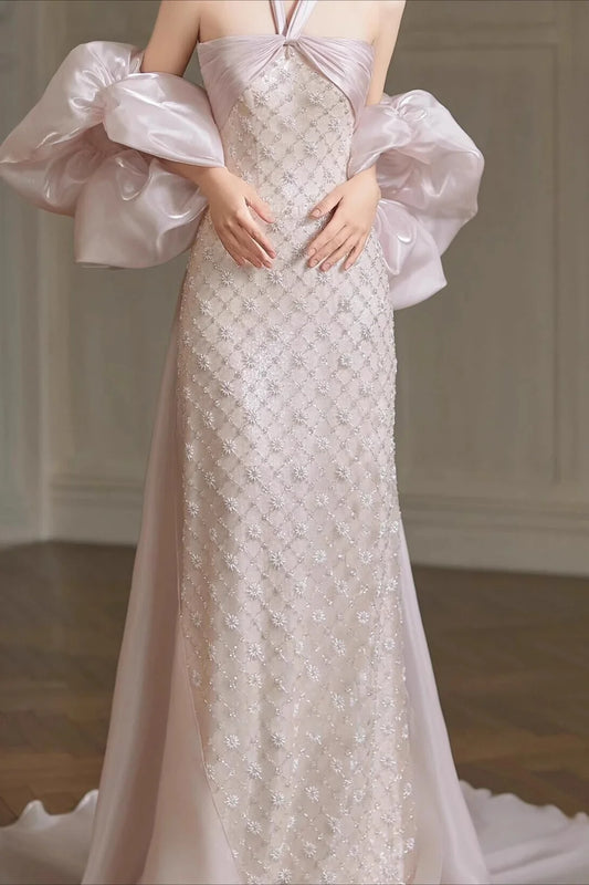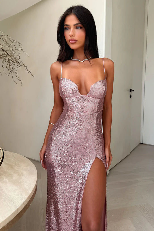 Beaded Neckline Long Sequined Ball Gown Slit Evening Dress Sexy