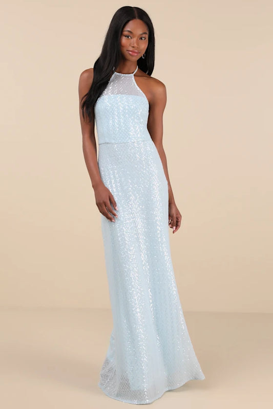 Enchanting Dusty Blue Spaghetti-Strap Sequin A-Line Formal Gown