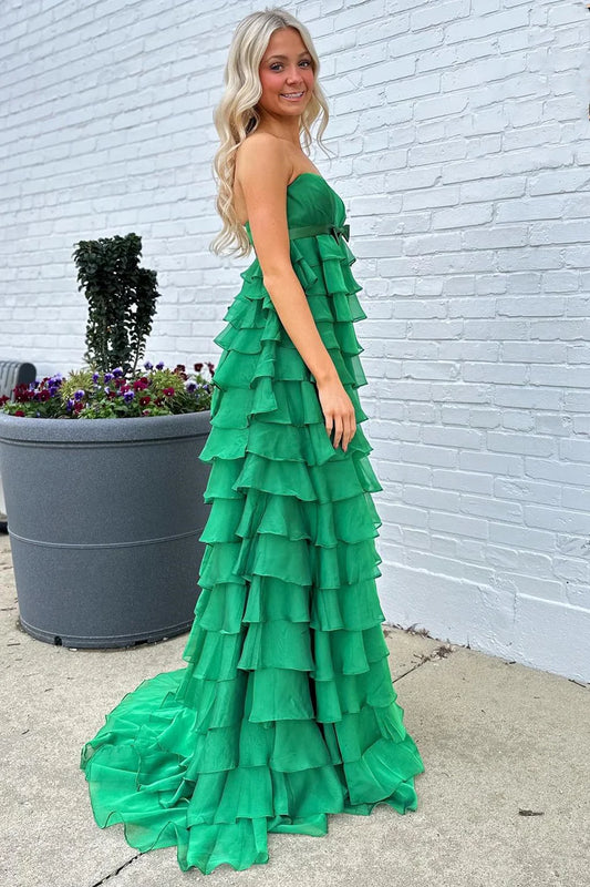 Luxury Emerald Green Evening Dresses Strapless with Chiffon Silhouette and Ruffled Skirt