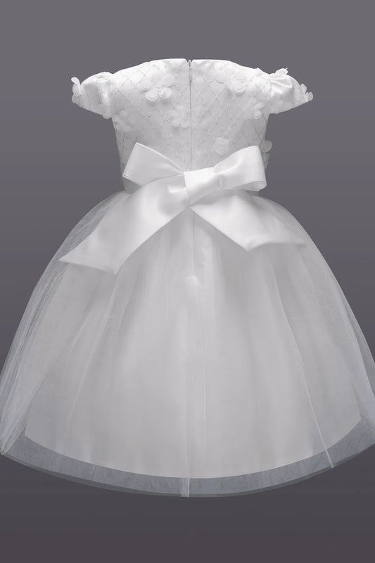 White 3D Flower Cap Sleeve Bow-Back Flower Girl Dress