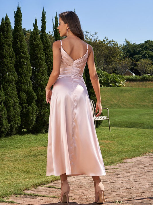 A-Line/Princess Silk like Satin Ruched V-neck Sleeveless Ankle-Length Bridesmaid Dresses