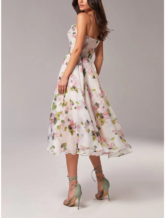A-Line Homecoming Dresses Princess Dress Wedding Guest Holiday Tea Length Sleeveless Spaghetti Strap Organza with Print