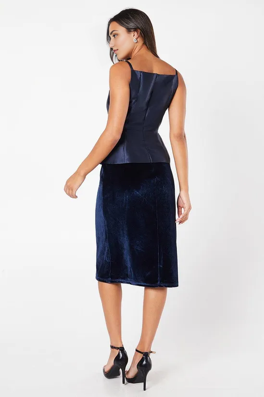 Square Neck Twill Bodice Velvet Skirt Pencil Dress Wedding Guest Dresses