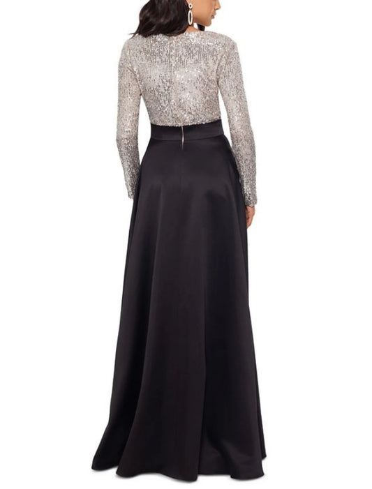 Sheath / Column Mother of the Bride Dress Wedding Guest Party Sparkle & Shine V Neck Floor Length Satin Sequined Long Sleeve with Bow(s) Pleats