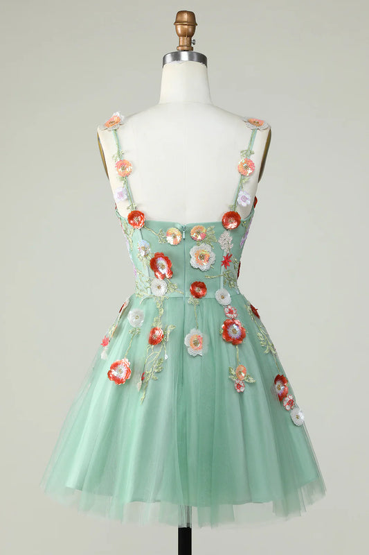 A Line Homecoming Dress Spaghetti Straps Black Sequin Flowers Mini Dress