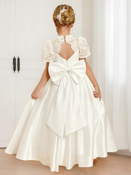 A-Line/Princess High Neck Short Sleeves Satin Flower Girl Dresses with Bow
