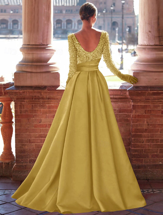 A-Line Satin Sequin Evening Gown Floor Length Long Sleeve Jewel Neck with Glitter