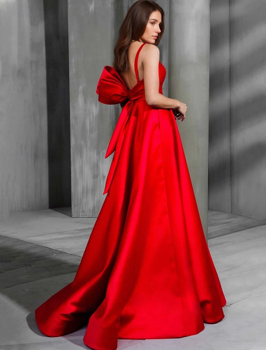 A-Line Evening Gown Christmas Dress Sleeveless V Neck Satin with Bow(s)