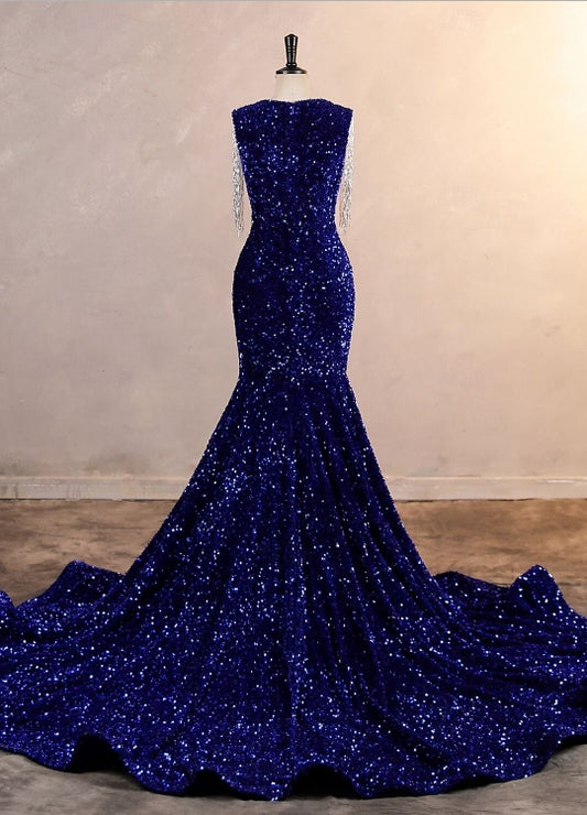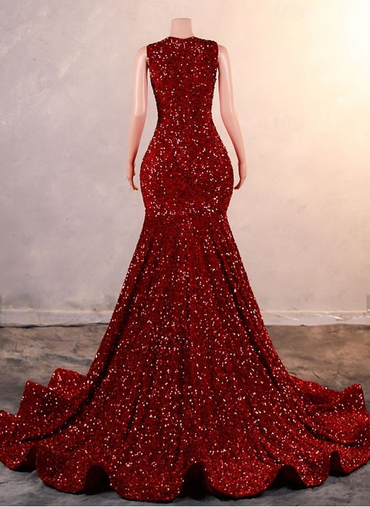 Mermaid / Trumpet Evening Gown Party Engagement Court Train Sleeveless Jewel Neck Fall Wedding Guest Sequined with Sequin
