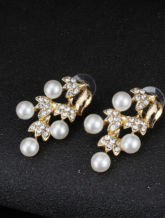 Two-piece Suit White Imitation Pearl Rhinestone 1 Necklace Earrings Women's Basic Fashion Korean Classic Leaf Jewelry Set