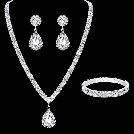Bridal Jewelry Sets Three-piece Rhinestone Alloy Earrings Necklace Bracelets Simple Luxury Tennis Chain Drop Jewelry Set