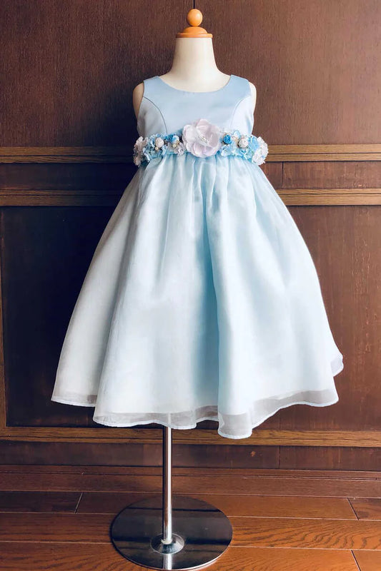 Light Blue Round Neck Belted A-Line Flower Girl Dress