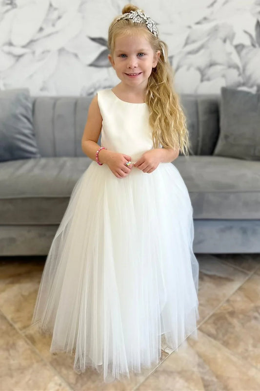 White Tulle Round Neck Bow-Back Flower Girl Dress