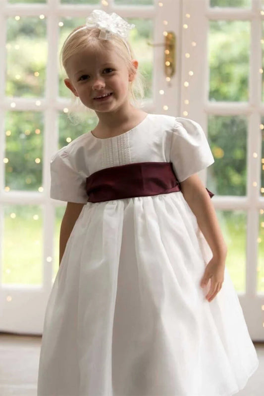 Off White Satin Puff Sleeve Banded Waist Bow Girl Party Dress