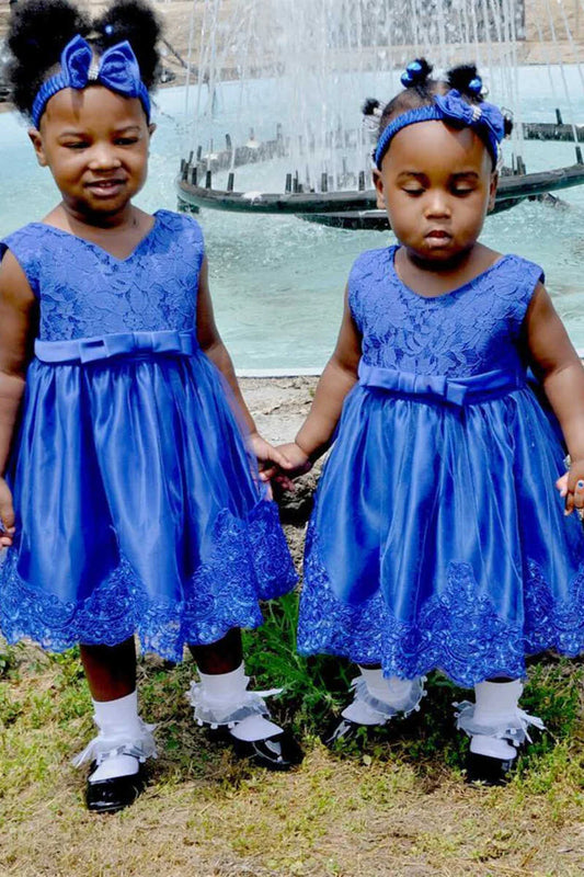 Ocean Blue Lace Bow Back Flower Girl Dress