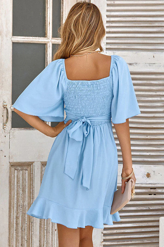 Simple V-neck solid color waist ruffled dress Homecoming dresses