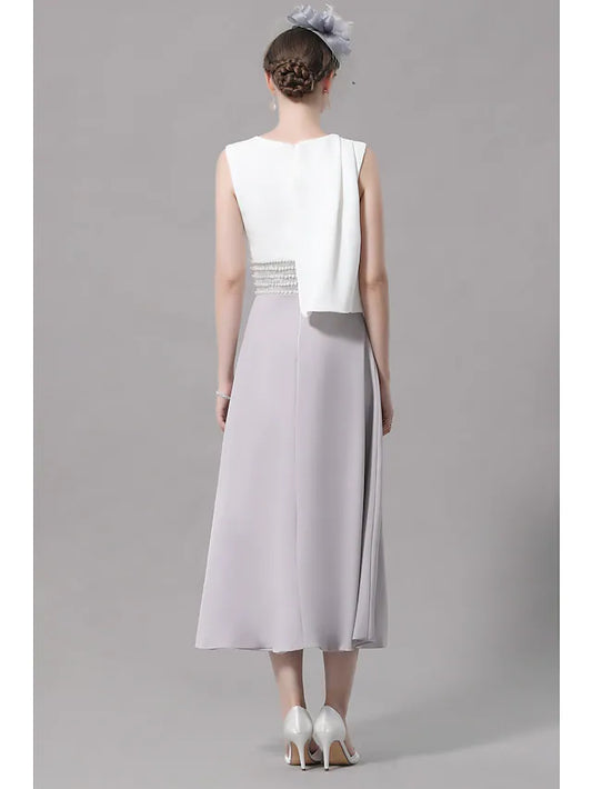 Mother of the Bride Dress Elegant Jewel Neck Tea Length Chiffon Sleeveless with Beading