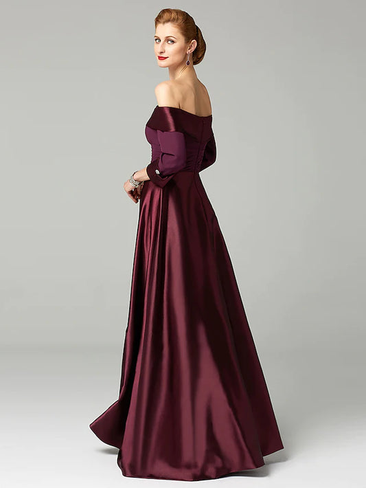 Mother of the Bride Dress Off Shoulder Ankle Length Stretch Satin Half Sleeve with Ruched Beading