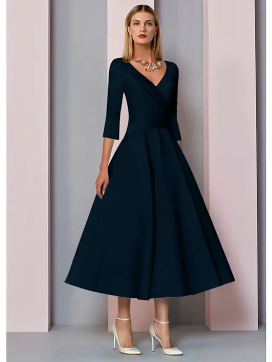 Mother of the Bride Dress Wedding Guest Vintage Plus Size Elegant V Neck Tea Length Satin Length Sleeve with Pleats