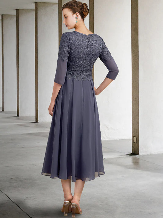 A-Line Mother of the Bride Dress Plus Size Elegant V Neck Tea Length Chiffon Lace Length Sleeve with Ruffles Appliques