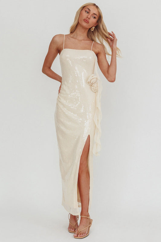 Cream Sequin 3D Flower Spaghetti Strap High Slit Maxi Prom Dress