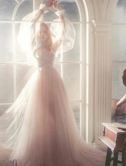 A-Line Elegant Boho Engagement Formal Evening Birthday Dress Scoop Neck Long Sleeve Sweep / Brush Train Tulle with Pleats Ruched