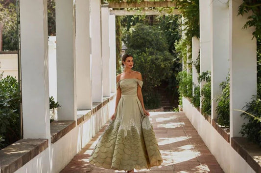 Sage Green Satin Maxi Dresses with Off Shoulder V Neck Back Lace Up Scaled Skirt and Beaded Embroidery