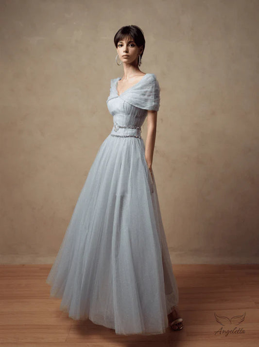 Light Blue Sparkle Tulle Maxi Dresses with Off Shoulder V Neck Beaded Belt and Full Skirt