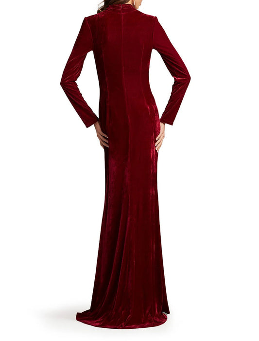 A-Line Mother of the Bride Dress Formal Wedding Guest Party Elegant V Neck Floor Length Velvet Long Sleeve with Split Front Ruching