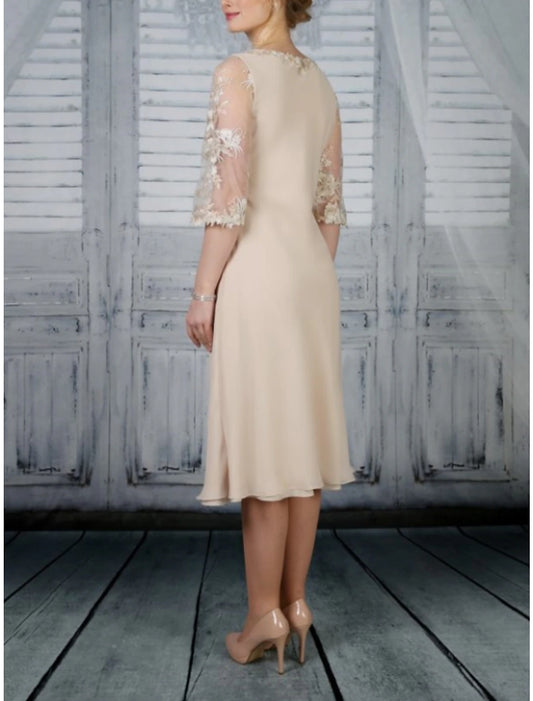 Sheath / Column Mother of the Bride Dress Wedding Guest Party Elegant Scoop Neck Tea Length Chiffon Lace Half Sleeve with Ruffles Solid Color