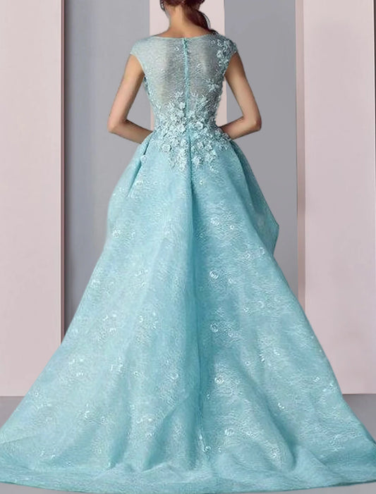 Sheath / Column Mother of the Bride Dress Formal Wedding Guest Party Elegant Scoop Neck Floor Length Lace Short Sleeve with Ruffles Appliques