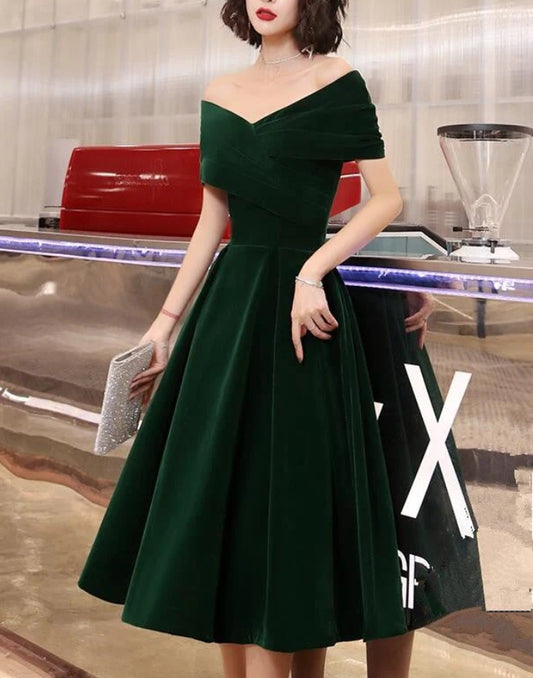 Green Velvet Off Shoulder Vintage Style Bridesmaid Dress Tea Length Party Dress Homecoming Dress