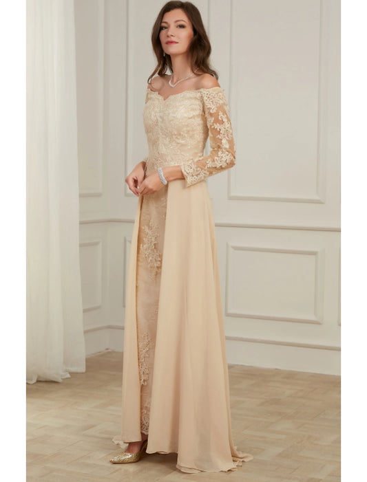 A-Line Evening Gown Elegant Dress Wedding Guest Formal Evening Floor Length Long Sleeve Off Shoulder Polyester with Overskirt Appliques