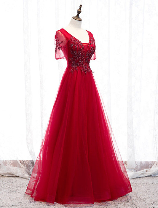 A-Line Prom Dresses Luxurious Dress Wedding Guest Formal Evening Floor Length Short Sleeve Spaghetti Strap Tulle with Beading Appliques