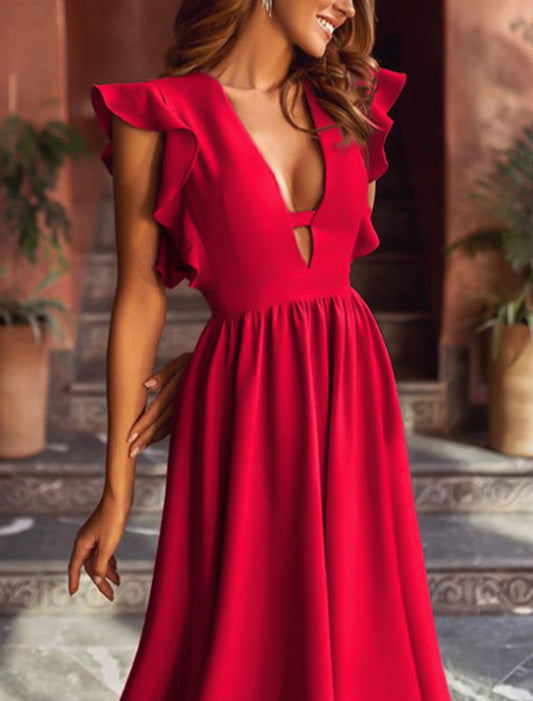A-Line Princess Cute Wedding Guest Prom Dress V Neck Sleeveless Tea Length Stretch Fabric with Ruffles Pure Color