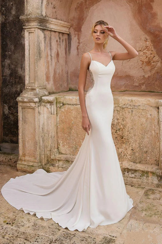 Elegant Satin Slim-Fit Spaghetti Strap V-Neck Beaded Mermaid Train Wedding Gown