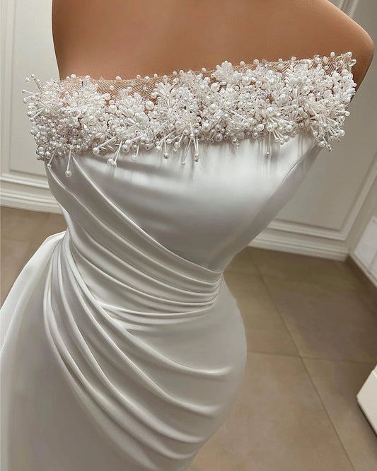 Mermaid Satin Wedding Dress Long Strapless Dress With Pearls