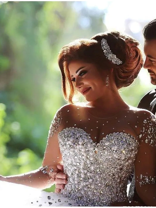 Wedding Dresses Court Train Ball Gown Long Sleeve Jewel Neck Satin With Crystals Beading