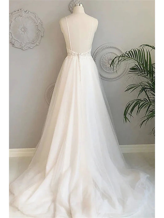 Beach Wedding Dresses Court A-Line Sleeveless Spaghetti Strap Lace With Buttons Appliques