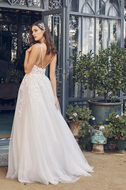 3D floral embroidery long V-neck wedding dress
