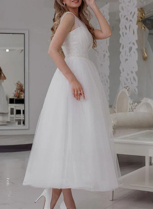 A-line V-neck sleeveless sequin and ankle sheer wedding dress