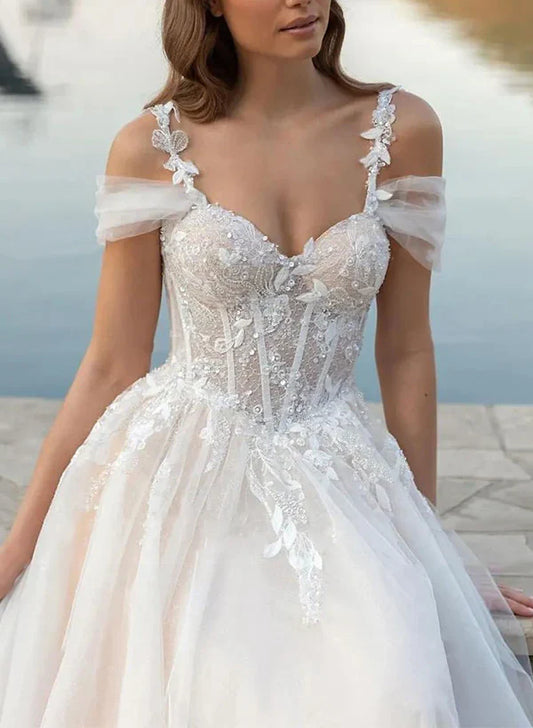 3D flower decal long open shoulder transparent tight corset wedding dress