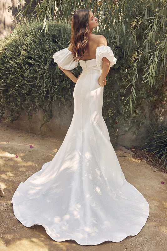 Flower Embroidered White Bubble Sleeve Long Wedding Dress
