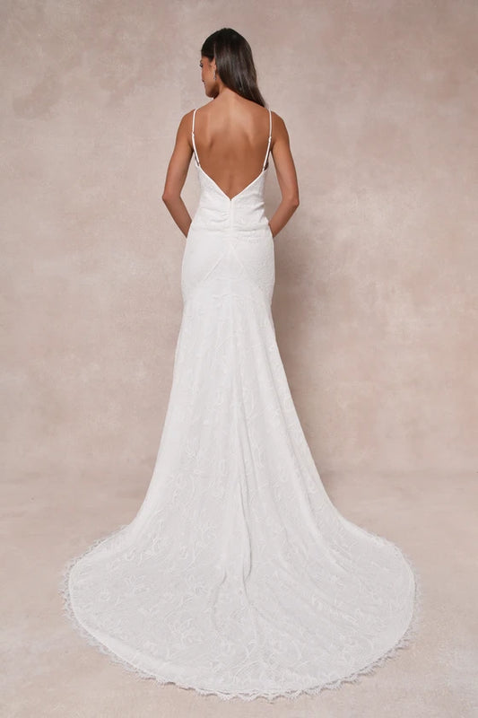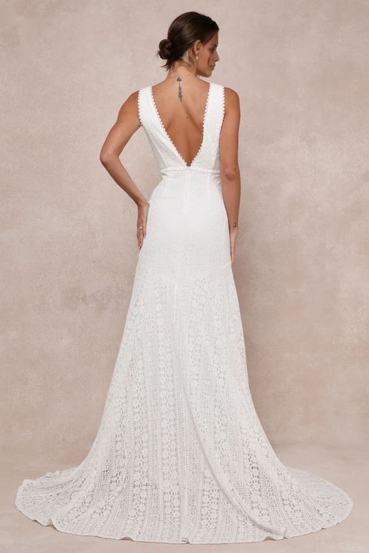 White Lace V-Neck Trumpet Hem Maxi Dress Chapel Train Wedding Dress