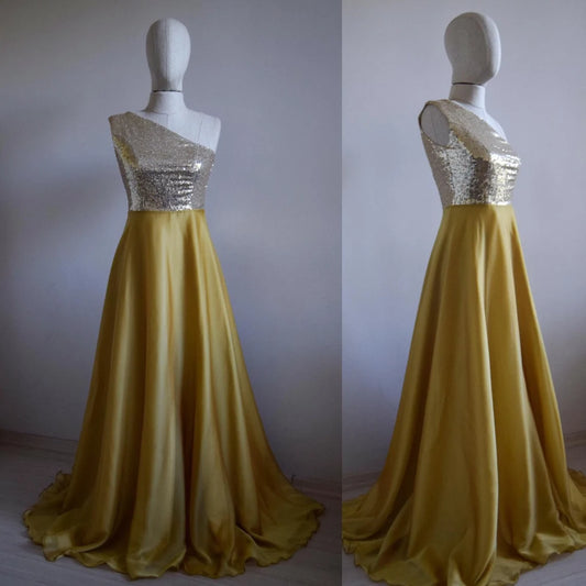 One-Shoulder Gold Sequin Bridesmaid Dress Wedding Party Sparkly One Shoulder Chiffon Dress